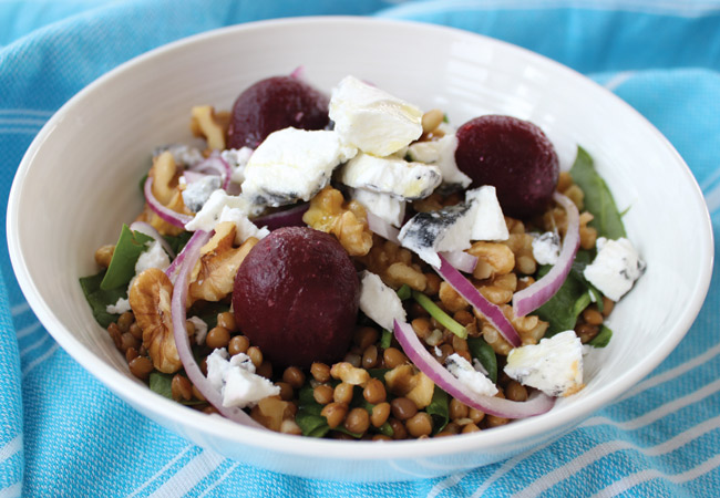 Thoroughly wash lentils and add to a small saucepan with water. Bring to a fast simmer over a medium-high heat, then reduce to a gentle bubble. Cook uncovered, for 20 to 30 minutes until tender. Add additional water as needed to ensure lentils are just covered. Strain lentils, stir through spinach and divide between two bowls. Top with onion and fresh baby beets and crumble over walnuts and goats cheese.