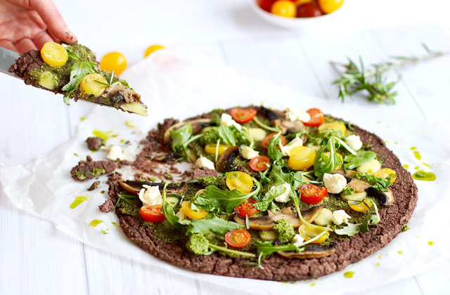 Mix together 1⁄3 cup water with the chia seeds and ground flax, and let it sit for 10 minutes until thick and gelatinous. In a food processor, add the beans, flax and chia mix, nutritional yeast, garlic, salt and cayenne. Blend until smooth. Spread mixture onto the parchment paper in the shape of a pizza crust, until about half an inch thick.