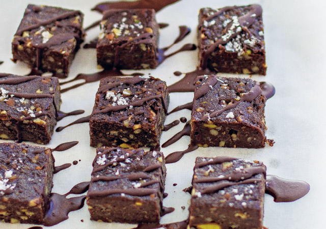 Press the mixture into a brownie pan, drizzle with melted dark chocolate, and freeze for 2 hours.