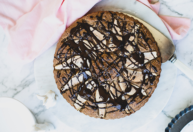 Cover with a loose sheet of aluminium foil to help the pastry retain moisture. Drizzle with melted chocolate mixed with tahini, slice and serve or store in an airtight container in the fridge for up to 5 days.