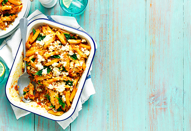 Combine pasta and beef mixture in an 8-cup capacity ovenproof dish. Sprinkle with ricotta, parmesan and pine nuts. Bake for 15 to 20 minutes until golden. Serve hot.