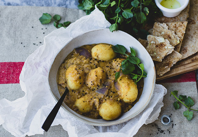 To make the wraps, drizzle two of the wraps with olive oil, spread with crushed garlic and top with the other wraps. Heat in a sandwich press or on a hot frying pan for 2 minutes. To serve, divide the curry between serving bowls, add watercress and serve with the hot wraps on the side.