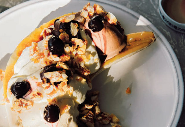 This is a classic banana split, tweaked with a bit more technique involved. It’s still a banana split at heart, though.
