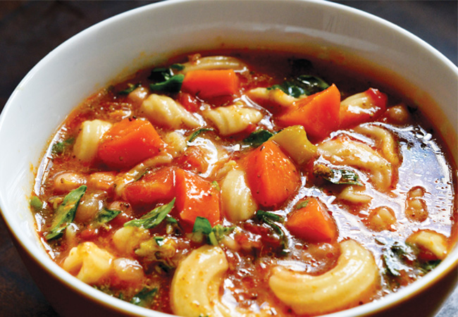 Add carrots, chickpeas, canned and fresh tomatoes, water and pasta shells along with some salt; bring to a gentle simmer and cook over a low-medium heat for four hours. Alternatively, you can use a standard pot and boil, then lower the heat and cook for 30 minutes or until carrots are tender.